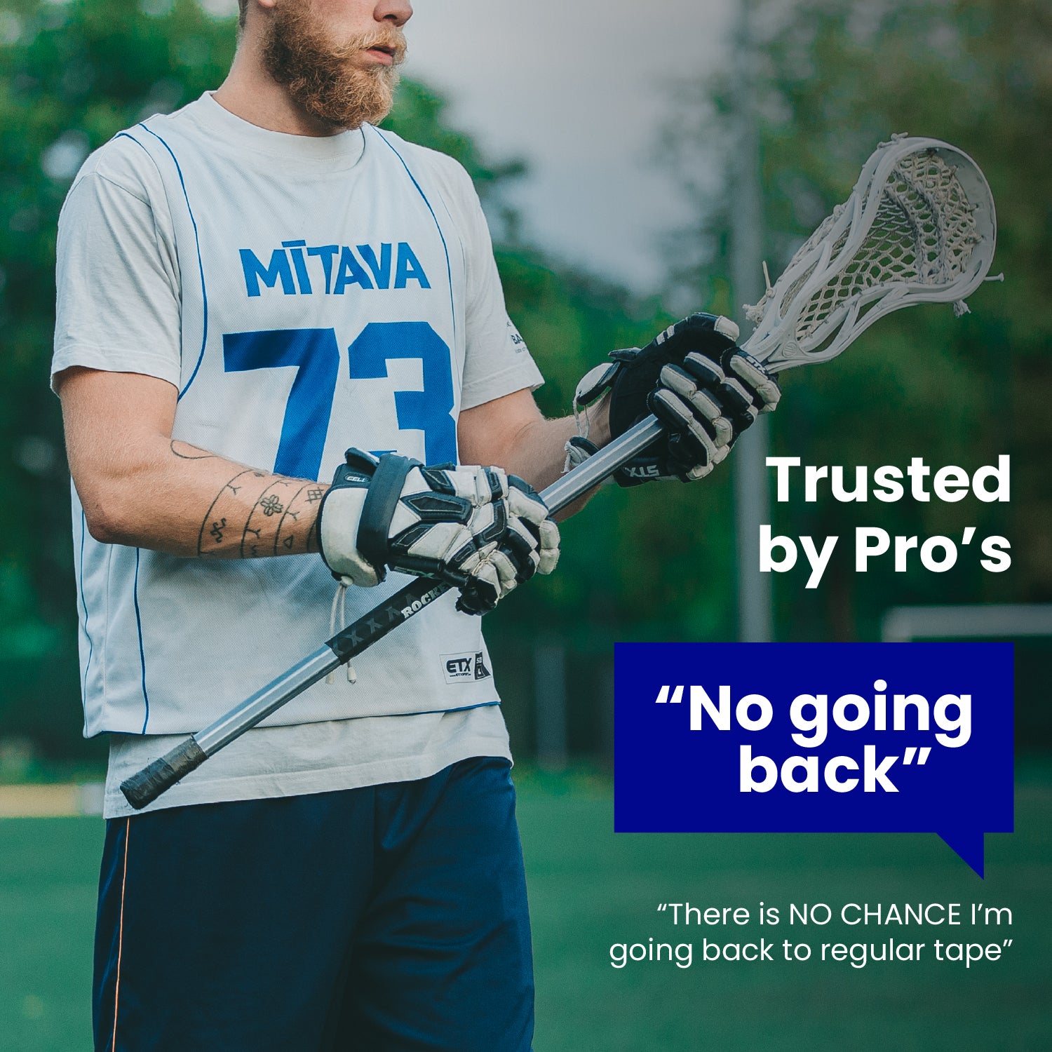 RocketGrip typically lasts the lifetime of your stick and performs ~10x longer than standard lacrosse tape — no re-taping every practice, no sticky glove residue.